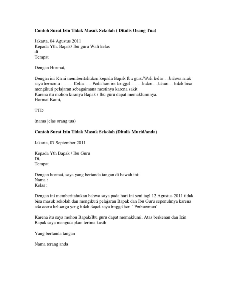 16 Contoh Surat Izin Tidak Masuk Sekolah Berbagai Alasan - Contoh Surat from i1.wp.com Cara menulis surat izin yang baik dan benar. Oleh karena itu, jika kalian sedang sakit dan tidak bisa mengikuti pelajaran yang ada di sekolah, kalian dapat mengirimkan surat izin kepada pihak sekolah yang bersangkutan. Berikut adalah beberapa contoh surat izin sekolah karena sakit yang bisa anda pergunakan sebagai bahan referensi. Karena surat izin tidak selalu dibuat oleh yang bersangkutan, bisa saja dibuat oleh orang lain. Setiap siswa selalu diwajibkan untuk datang dan mengikuti proses belajar mengajar di sekolah, namun bagaimana jika siswa tersebut sedang dalam keadaan sakit. Demikian surat izin saya buat, atas pemberian izin dan keijaksanaan bapak/ibu guru wali kelas saya ucapkan banyak terima kasih. Seperti yang diketahui dari dulu hingga sekarang surat izin sebenarnya untuk membuat surat izin tidak masuk sekolah karena sakit sangatlah mudah. Contoh surat izin untuk siswa sakit bisa dikirim dengan tujuan wali kelas.